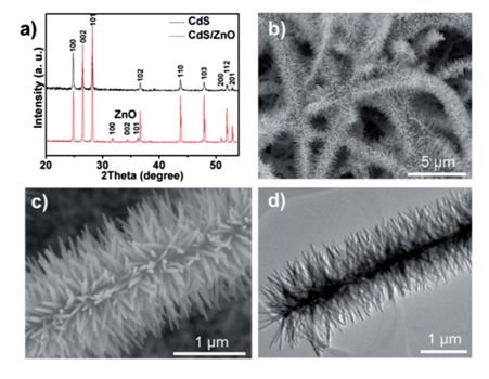 圖1:(a)CdS納米帶與CdS/ZnO樹(shù)枝狀異質(zhì)結(jié)的XRD峰對(duì)比。(b)低倍數(shù)SEM下觀(guān)測(cè)到的CdS/ZnO樹(shù)枝狀異質(zhì)結(jié)。(c)(d)分別對(duì)應(yīng)SEM和TEM下觀(guān)測(cè)到的CdS/ZnO樹(shù)枝狀異質(zhì)結(jié)。