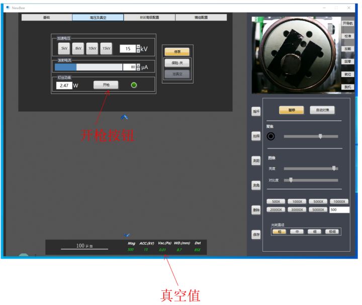 2、按照需要設定電壓值。并將"光斑直徑"調整至"粗"或者"中",勾選"自適應"按鈕,調整"亮度""對比度",至出現較為明亮的圖像。后粗調"聚焦"條,至顯示較為清晰的圖像,然后將樣品臺移動到想要拍照的樣品上。