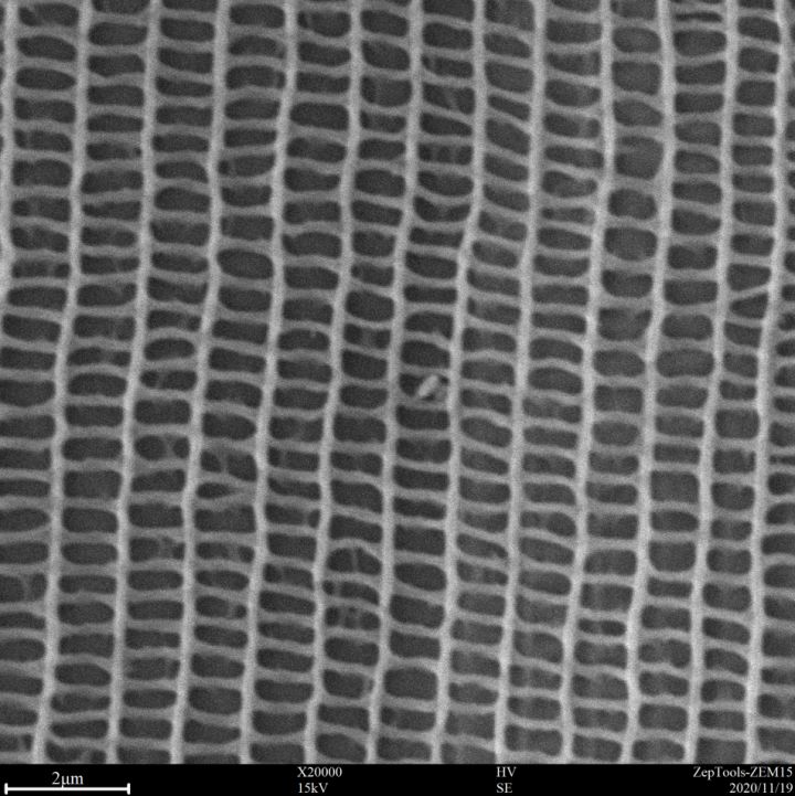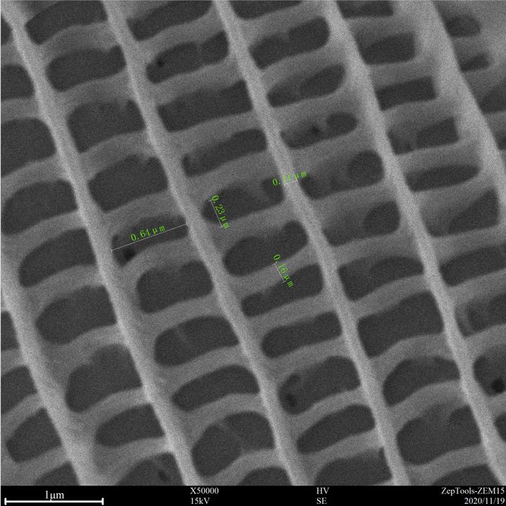 50000倍下,結(jié)構(gòu)色的奧秘盡收眼底,100-150 nm左右的細(xì)絲組成了300*650 nm左右的方格,這些方格進而組成周期結(jié)構(gòu),就是這些密排結(jié)構(gòu)接受外來光線以后能發(fā)生不同的折射、干涉,然后反射出部分特殊光頻率的光線而產(chǎn)生不同的色彩。